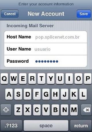 | + | '''Nome do Host''' ou '''Host Name''': Digite '''pop.splicenet.com.br''' | ||