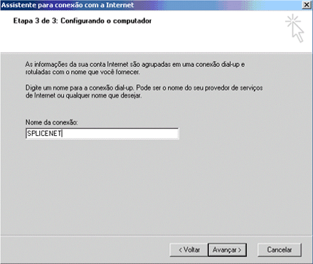 Em Nome da conexão digite SpliceNet e clique em Avançar'.