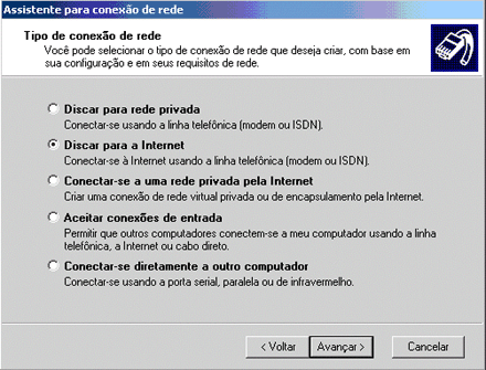 Escolha a opção Discar para a Internet e clique em Avançar.