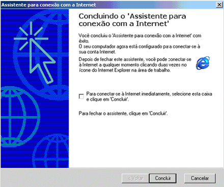 Desmarque a opção Para conectar-se á Internet imediatamente, selecione esta caixa e clique em Concluir.