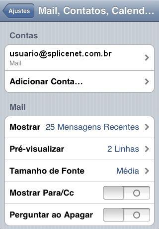ATENÇÃO: Removendo as configurações de uma conta de e-mail do iPhone também EXCLUI as mensagens da respectiva conta salvas no iPhone. Caso não queira perder as mensagens salvas no iPhone utilize o procedimento de Verificação das configurações: -> e-mail@splicenet.com.br -> e-mail@dominio