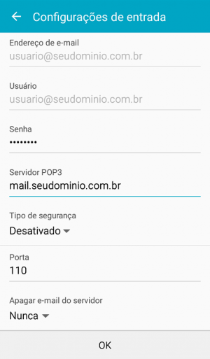 - Servidor POP3: deve ser mail.seudominio.com.br (Lembrando que deve substituir seudominio.com.br pelo nome do seu domínio.)