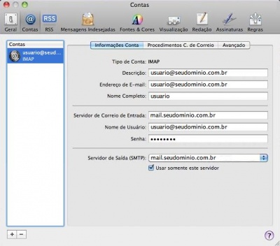 - Descrição: identificação do servidor no Apple Mail, para facilitar a identificação, em nosso exemplo preenchemos com o nome do servidor mail.seudominio.com.br, mas pode ser algum outro nome de sua preferência.