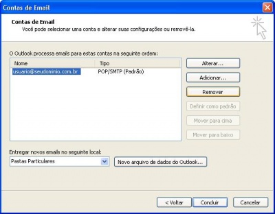 | ATENÇÃO: Removendo do Microsoft Outlook 2003 a configuração de uma conta de e-mail não exclui as mensagens da respectiva conta salvas no Microsoft Outlook 2003.
