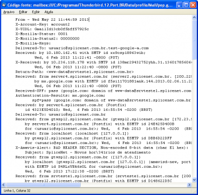 2. Será aberta uma nova tela com o código fonte da mensagem, contendo o cabeçalho da mensagem.