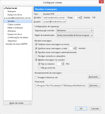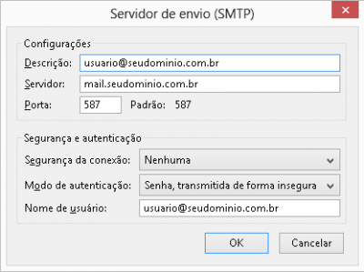 - Servidor: deve estar como mail.seudominio.com.br (Lembrando que deve substituir seudominio.com.br pelo nome do seu domínio.)