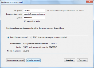 - Nome do servidor: digite mail.seudominio.com.br (Lembrando que deve substituir seudominio.com.br pelo nome do seu domínio.)