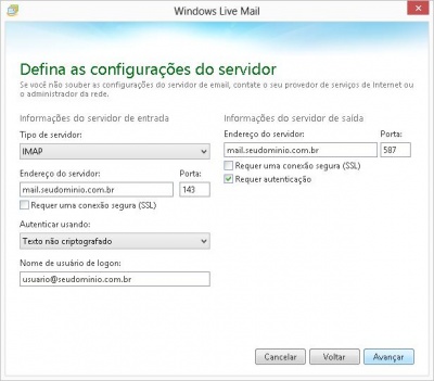 - Endereço do servidor: digite mail.seudominio.com.br (Lembrando que deve substituir seudominio.com.br pelo nome do seu domínio.)
