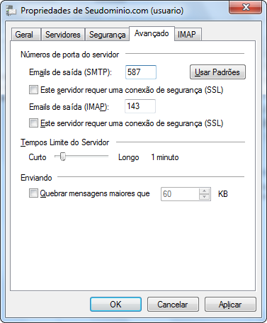 - Emails de saída (IMAP): deve estar configurado como mail.seudominio.com.br (Lembrando que deve substituir seudominio.com.br pelo nome do seu domínio.)